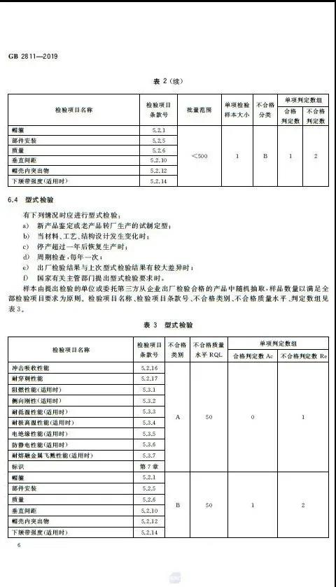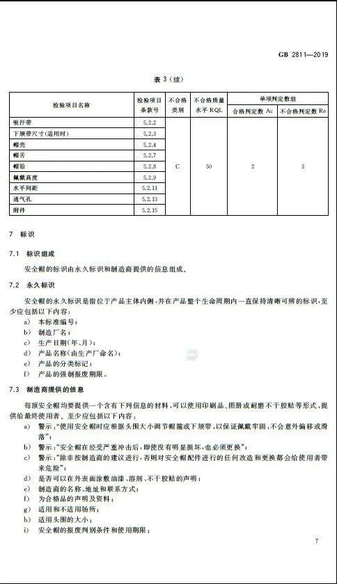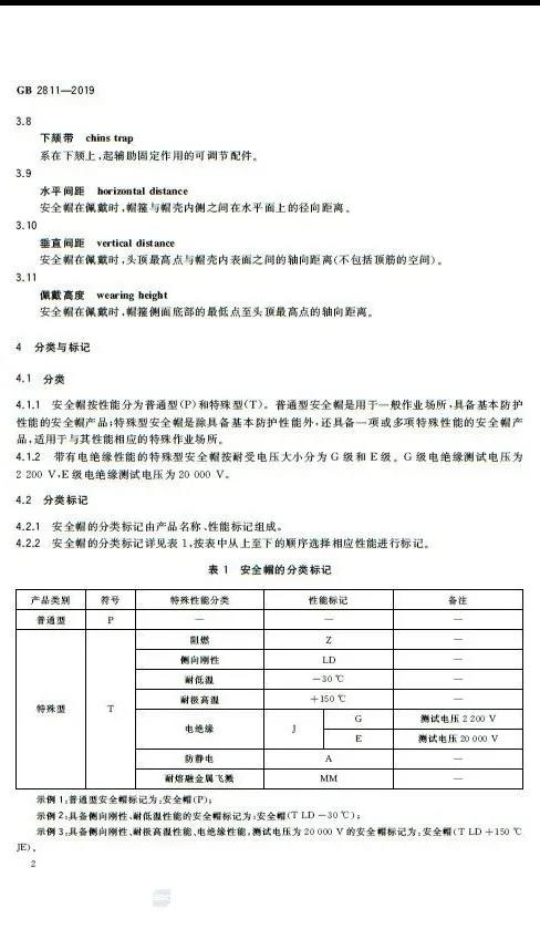 · 修改了標準適用范圍 · 修改了部分術語和定義的措辭,并刪除了部分術語 · 增加了安全帽的分類 · 修改了對于安全帽質量的要求 · 修改了對于佩戴高度的要求 · 修改了對于通氣孔的要求 · 修改了對于耐低溫性能的要求 · 增加了對于耐極高溫性能的要求 · 修改了對于電絕緣性能的要求 · 修改了對于防靜電性能的要求 · 增加了對于耐熔融金屬飛濺性能的要求 · 修改了對于安全帽永久標識的要求 新版的GB2811-2019規定,在安全帽內側,全生命周期內必須清晰保持以下6項標識: a)本標準編號; b)制造廠名; c)生產日期(年、月); d)產品名稱(由生產廠命名); e)產品的分類標記; f)產品的強制報廢期限。 原文如下: